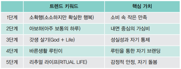 트렌드의 출발점은 ‘소확행(小確幸)’이었다. 2017년 전후로 유행한 이 키워드는 ‘작지만 확실한 행복’, 즉 커다란 성공이나 성취가 아니라 하루 한 잔의 커피, 좋아하는 책 한 권, 좋아하는 사람과의 저녁 식사처럼 소소하지만, 실현 가능한 만족을 추구했다.