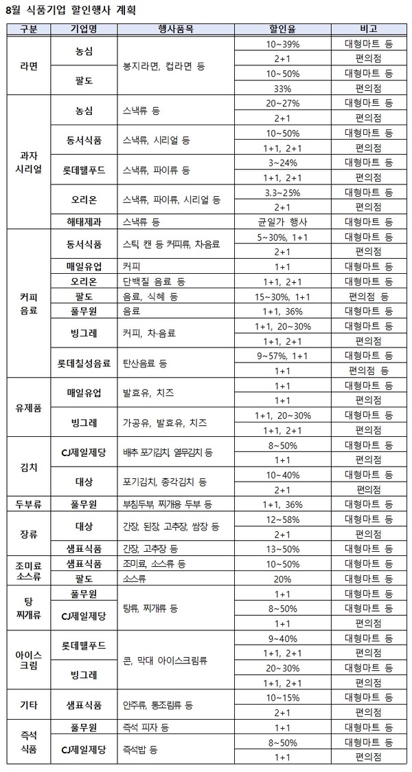 업계는 지난 7월 여름 휴가철 소비가 많은 제품을 중심으로 할인행사를 시작했으며, 8월에도 소비자물가 체감도가 높은 라면, 과자, 커피·음료류, 아이스크림, 탕·찌개류 등을 중심으로 할인행사를 지속한다.
